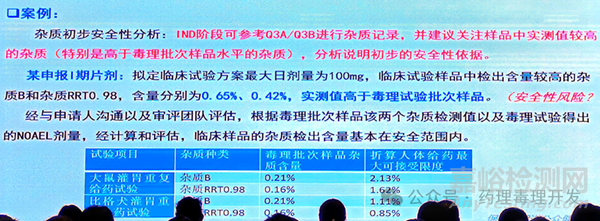 同時(shí),姚老師還給出了一個(gè)具體案例,采用非臨床研究中兩個(gè)種屬的NOAEL劑量,毒理批雜質(zhì)的水平,再結(jié)合臨床方案中最大給藥劑量,得出基于動(dòng)物的人體最大可接受限度。但由于案例中未給出具體NOAEL劑量,不確定種屬間劑量換算的方式。