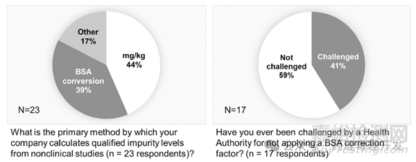 關(guān)于這點(diǎn),來自BMS、Merck、Novartis、AbbVie、Pfizer、GSK、AZ和Gilead團(tuán)隊(duì)組成的IQ DruSafe Impurities Working Group進(jìn)行過一次調(diào)研,結(jié)果于2021年公布,如下圖所示,44%(10/23)的企業(yè)采用mg/kg,39%(9/23)的企業(yè)選用的BSA。未采用BSA進(jìn)行換算的企業(yè)中,59%并未受到監(jiān)管機(jī)構(gòu)的挑戰(zhàn),41%則被要求說明不選擇BSA的原因。當(dāng)然,在本文獻(xiàn)最后,作者總結(jié)到,雜質(zhì)限可根據(jù)mg/kg去界定,并認(rèn)為從安全性角度看,基于像BSA的轉(zhuǎn)換,似乎沒有必要。