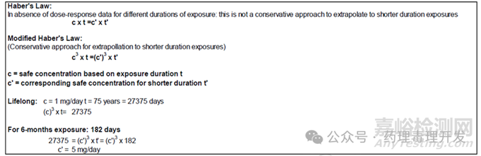 ICH的雜質(zhì)限度針對(duì)的是長(zhǎng)期用藥,甚至說是終生服藥的情況(safe dose of lifetime exposure),那么對(duì)于早期給藥周期<6個(gè)月的產(chǎn)品,這一閾值可以放寬到什么程度呢。有一種算法稱之為modification of Haber’s Law。根據(jù)這一計(jì)算方式,按照1mg/天的終生暴露水平計(jì)算,<6個(gè)月的暴露水平對(duì)應(yīng)的雜質(zhì)限度可提高到5mg/天,計(jì)算過程如下圖所示。同樣的,界定限度也從0.15%升高只0.7%。