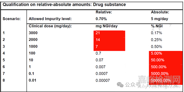 具體以5mg還是0.7%為準(zhǔn),與ICH原則一致,以數(shù)值小為準(zhǔn),舉例如下圖所示,100mg及以下每天用量,以0.7%為準(zhǔn),1000mg及以上用量則以5mg/天計(jì)算限度。該文章同樣拓寬制劑限度至5mg或2%,原理類似,篇幅所限,不再展開。