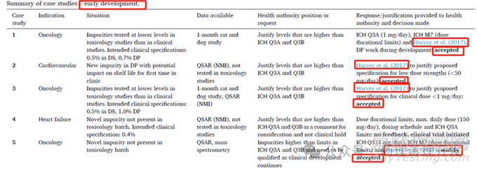 2024年,AZ和Ipsen團(tuán)隊(duì)發(fā)表了一篇《Non-mutagenic impurities-Recent industry experience of using dose durational limits in drug development》,總結(jié)了來自European Federation of Pharmaceutical Industries and Associations (EFPIA)的六個(gè)成員企業(yè)關(guān)于非基因毒性雜質(zhì)超出ICH Q3A和Q3B規(guī)定的限度后,與監(jiān)管機(jī)構(gòu)的溝通案例。下圖中的5個(gè)案例,均處于早期臨床研究階段,3個(gè)腫瘤適應(yīng)癥,2個(gè)非腫瘤適應(yīng)癥,要么超限,要么出現(xiàn)了新的雜質(zhì),監(jiān)管機(jī)構(gòu)要求對(duì)不符合ICH Q3A和Q3B的要求進(jìn)行解釋。其中4個(gè)采用前文所述的Harvey等人發(fā)布的限度進(jìn)行解釋,被監(jiān)管機(jī)構(gòu)接受。