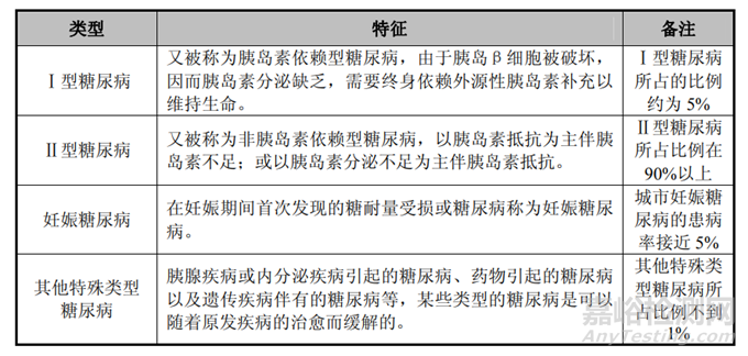 糖尿病是由于胰腺分泌功能缺陷或胰島素作用缺陷引起的,以血糖升高為特征的代謝性疾病。糖尿病典型的癥狀是“三多一少”,即多飲、多尿、多食及消瘦。糖尿病患者若血糖長期控制不佳,可導致器官組織損害,伴發(fā)各種器官,尤其是眼、心、血管、腎、神經(jīng)損害或器官功能不全或衰竭,嚴重可致患者殘疾或 者死亡。按照世界衛(wèi)生組織(WHO)及國際糖尿病聯(lián)盟(IDF)專家組的建議,糖尿病可分為Ⅰ型、Ⅱ型、其他特殊類型及妊娠糖尿病 4 種,其中,Ⅰ型和Ⅱ型是最 主要的兩種類型,各類型糖尿病患者特點如下: