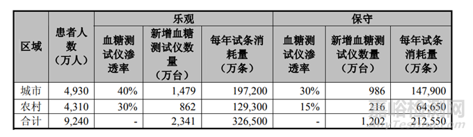 隨著血糖測試儀滲透率的提升,無論是血糖測試儀還是配套試條市場容量都非常廣闊,不考慮新增糖尿病患者和糖耐量受損人群的需求,未來 5 年,分樂觀、 保守兩種情況預測血糖監(jiān)測系統(tǒng)市場需求如下: