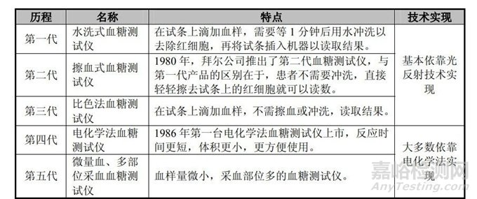 湯姆•克萊曼斯(Tom Clemens)1968 年開發(fā)出血糖測試儀模型,并于當年申請專利,不久拜耳公司將其產(chǎn)業(yè)化。至今血糖測試儀技術已經(jīng)歷了五個發(fā)展階段,具體如下表所示: