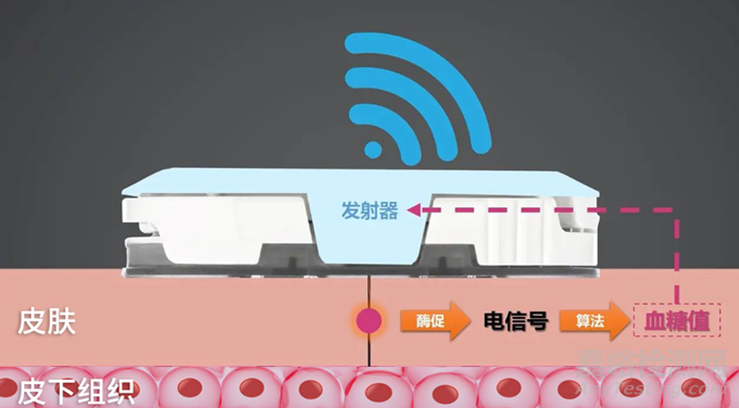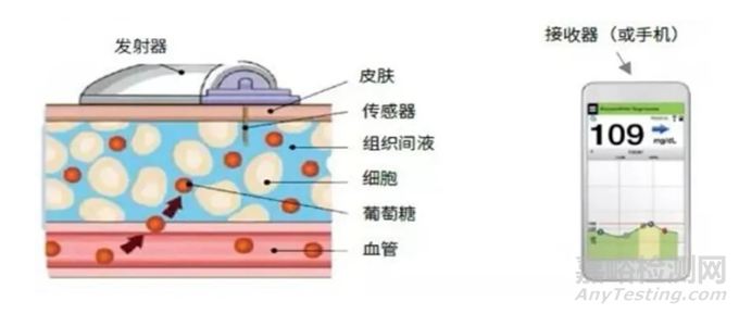 CGM是一種新型微創(chuàng)血糖監(jiān)測技術,主要通過埋植于皮下組織的微電極,記錄組織間液葡萄糖氧化反應產(chǎn)生的電信號,間接反映測量血糖值。