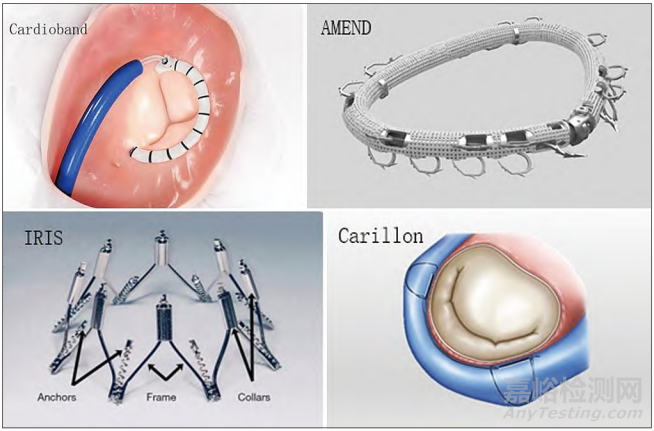 傳統(tǒng)的縮環(huán)技術(shù)創(chuàng)傷大,并發(fā)癥較多,能否使用介入方式實(shí)現(xiàn)縮環(huán)是產(chǎn)業(yè)界重點(diǎn)研究方向之一。歐美對(duì)此研究較多,實(shí)現(xiàn)方式各異(見(jiàn)圖5)。愛(ài)德華Cardioband系統(tǒng)由帶有聚酯織物覆蓋物的收縮線(xiàn)制成,在透視和經(jīng)食管超聲下植入,不銹鋼錨固定到位,通過(guò)導(dǎo)線(xiàn)夾緊順序錨,控制二尖瓣環(huán)形尺寸并減少瓣膜反流。Valcare Medical的AMEND是一種半剛性D形環(huán),經(jīng)心尖植入,通過(guò)12個(gè)錨固定在二尖瓣環(huán)上。環(huán)的后側(cè)首先固定,然后向前側(cè)拉動(dòng),將前后尺寸減小15%~25%,然后將前部固定在前環(huán)上完成植入,減少二尖瓣反流并改善小葉覆蓋。波士頓科學(xué)的IRIS環(huán)是一種半剛性鎳鈦環(huán),由基座和八個(gè)螺旋錨組成,錨釘入瓣環(huán)組織,通過(guò)移動(dòng)八個(gè)滑塊,使兩個(gè)相鄰的錨更靠近。其臨床報(bào)告顯示,患者二尖瓣外側(cè)直徑顯著減小,返流狀況顯著改善[3]。Cardiac Dimensions公司的Carillon Mitral Contour System®由近端錨和遠(yuǎn)端錨組成,通過(guò)弧形絲連接,植入冠狀竇以?shī)A緊二尖瓣,使瓣環(huán)直徑縮小,減少反流。同時(shí),它不改變瓣膜區(qū)域的結(jié)構(gòu),不影響未來(lái)對(duì)瓣膜的其他治療方案。數(shù)據(jù)顯示,Carillon器械顯著降低二尖瓣反流體積和左心室體積[4]。國(guó)內(nèi)也有多家機(jī)構(gòu)布局瓣環(huán)環(huán)縮領(lǐng)域。杭州德晉醫(yī)療聯(lián)合華西醫(yī)院和國(guó)家生物醫(yī)學(xué)材料中心研發(fā)的DragonRing是中國(guó)首款房室瓣瓣環(huán)環(huán)縮技術(shù)。