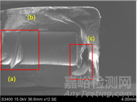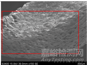 掃描電鏡形貌結果顯示,NG件斷裂面孔洞缺陷處表面較為粗糙,呈現(xiàn)“顆粒狀”(見圖1);并且NG件螺孔內表面有明顯的弧形凹陷形貌(見圖2);靠近孔洞缺陷的一側斷面較為平整(見圖2(a)區(qū));另一側斷面較粗糙、有弧形擴展紋、靠近外邊緣有臺階狀形貌(見圖2(b)區(qū)、(c)區(qū))。