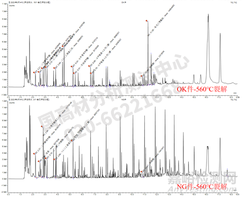 根據(jù)定性定量成分分析測試結果表明,NG件和OK件主要成分均為POM材質,助劑和填料成分存在差異。其中OK件中含有較多苯代三聚氰胺BGA,且含量高于NG件,其抗氧劑含量也高于NG件;NG件中含有硫酸鋇和磷酸三苯酯,而OK件幾乎沒有。