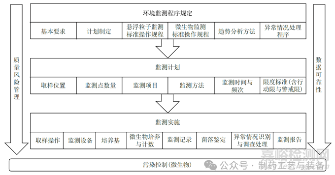 質(zhì)量風(fēng)險(xiǎn)管理貫穿藥品生產(chǎn)潔凈環(huán)境監(jiān)測的全過程,數(shù)據(jù)可靠性是藥品生產(chǎn)潔凈環(huán)境監(jiān)測的基礎(chǔ);環(huán)境監(jiān)測計(jì)劃的制定需要基于風(fēng)險(xiǎn)評估,環(huán)境監(jiān)測的實(shí)施必須保證數(shù)據(jù)可靠性。根據(jù)藥品生產(chǎn)潔凈環(huán)境監(jiān)測開展的不同階段與邏輯,可從環(huán)境監(jiān)測程序規(guī)定、監(jiān)測計(jì)劃和監(jiān)測實(shí)施3個(gè)方面進(jìn)行分析。
