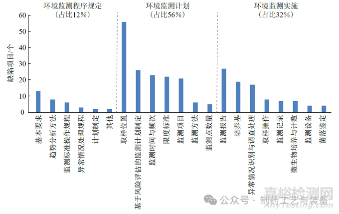 對2019 至2022 年我國國家藥品監(jiān)督管理局、美國FDA、歐洲藥品質(zhì)量管理局及WHO,在全球藥品生產(chǎn)企業(yè)檢查中針對藥品生產(chǎn)潔凈環(huán)境監(jiān)測提出的部分缺陷進(jìn)行了收集與整理,通過對近300 個(gè)環(huán)境監(jiān)測相關(guān)缺陷的統(tǒng)計(jì)分析,基于上述潔凈環(huán)境監(jiān)測要點(diǎn)分類,歸納出當(dāng)前藥品生產(chǎn)企業(yè)在環(huán)境監(jiān)測方面的常見問題分布(圖2)。