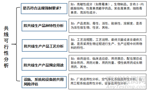 在實施多產(chǎn)品共線生產(chǎn)時,我們必須意識到完全消除產(chǎn)品間的交叉污染風險是不現(xiàn)實的。在GMP條件下,需要將交叉污染的控制程度與確定的患者風險水平相匹配。生產(chǎn)企業(yè)應遵守國家法規(guī)條例的基礎上,根據(jù)企業(yè)質(zhì)量體系特點,結合科學知識及經(jīng)驗實施風險管理。共線可行性分析是第一步,相關內(nèi)容請參見圖2。