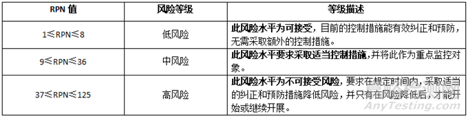 評價每項風險要素的失效影響,用S(嚴重度)、O(可能性)、D(可探測度)三個指標,每個指標劃分5級,對應分數(shù)均為1~5分,每級設定評價標準(限于篇幅,此處省略分級和評價標準的具體內(nèi)容)。最后計算風險系數(shù)RPN=S*D*P。RPN值在1~125之間,根據(jù)公司抗風險能力及公司實際情況,將風險水平等級設定為低風險、中等風險、高風險,見表6。