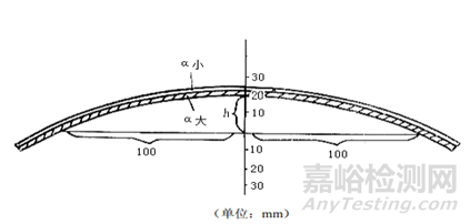 玻璃絲冷卻后,會(huì)向膨脹系數(shù)較大的一方彎曲,彎曲的程度與兩玻璃膨脹系數(shù)之差值成正比。如向供試品方向彎,則玻璃標(biāo)準(zhǔn)物質(zhì)的α0加上?α,反之則玻璃標(biāo)準(zhǔn)物質(zhì)的α0減去?α,即為供試品的線熱膨脹系數(shù)。用千分尺選測(cè)絲徑在0.10~0.14 mm的玻璃絲,截取220~230 mm長(zhǎng),讀出截取的長(zhǎng)度內(nèi)中點(diǎn)和兩端的絲徑,三個(gè)測(cè)量點(diǎn)的絲徑差應(yīng)不大于0.02 mm,取三個(gè)絲徑的平均值為d,以mm計(jì)。如玻璃絲彎曲程度大,截取長(zhǎng)度應(yīng)取長(zhǎng)些。把截好的玻璃絲呈自由狀下落放在玻璃板上,移動(dòng)玻璃板,使玻璃絲上兩點(diǎn)正對(duì)鏡面坐標(biāo)紙上距離中點(diǎn)相距100 mm處的兩個(gè)點(diǎn)上,讀出中間彎曲高度h,以mm計(jì),精確到小數(shù)點(diǎn)后1位。彎曲高度測(cè)3次,取平均值,如圖4所示。