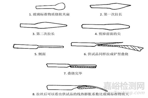 取一小塊的供試品(不應(yīng)有影響測(cè)試結(jié)果的玻璃缺陷,如結(jié)石、結(jié)瘤、氣泡等),粘于預(yù)先準(zhǔn)備的玻璃棒上,按上法做成鏟形,要求兩個(gè)鏟形寬度、厚度基本一致。將兩個(gè)鏟形重疊,燒在一起,不可有氣泡等玻璃缺陷,把沾有供試品的棒端燒掉。