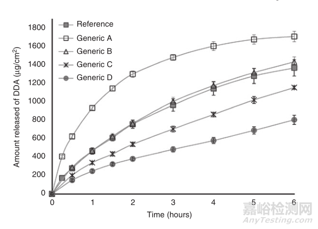 ▲圖2-參比制劑和四種市售仿制藥的雙氯芬酸二乙胺累積釋放量