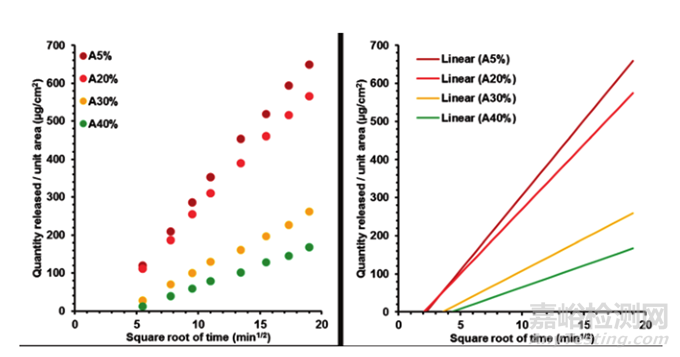 ▲圖3-丙二醇濃度(5%、20%、30%和40%)對(duì)阿昔洛韋藥物釋放的影響。