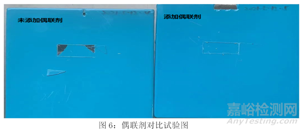 該產(chǎn)品使用在雙相不銹鋼基材上,雙相不銹鋼是在其固溶組織中鐵素體相與奧氏體相約各占一半,其Cr含量在18%-28%,Ni含量在3%-10%之間,具有良好的耐氯化物應(yīng)力腐蝕性能。其表面光滑度高,涂料在其表面附著力差,通過對不銹鋼進(jìn)行噴砂處理,提高表面粗糙度能夠有效提高涂膜對基材的附著力,但達(dá)不到產(chǎn)品最終的性能要求。因此利用偶聯(lián)劑的“架橋”作用,通過偶聯(lián)劑一部分基團(tuán)與樹脂進(jìn)行化學(xué)反應(yīng)、交聯(lián),另一部分基團(tuán)對基材和顏填料進(jìn)行有效的潤濕和包裹提高涂層對基材的附著力,提高涂層的致密性,從而提高涂層的耐陰極剝離性能和耐化學(xué)性,提高涂膜與不銹鋼基材的附著力,從而提高涂層的48h/95℃水浴和95℃陰極剝離性能。添加偶聯(lián)劑和不添加偶聯(lián)劑的95℃水浴試驗(yàn)如圖6。