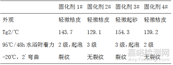 通過對四種固化劑的性能進(jìn)行綜合比較,最終選擇4#固化劑,同時(shí)對該固化劑的不同用量進(jìn)行試驗(yàn),確定其與環(huán)氧樹脂的最佳配比。