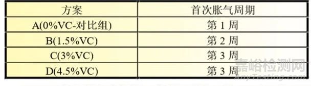 表1 不同VC含量電解液電池首次脹氣對應(yīng)的周期