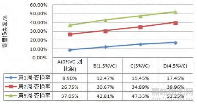 1.2 不同含量VC添加劑改進型電解液電池的試制
