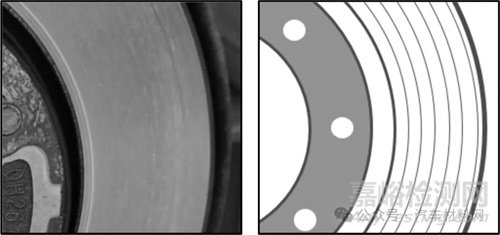 本研究采用的制動(dòng)盤為某OEM車型的量產(chǎn)產(chǎn)品,其原始加工狀態(tài)為磨削方式,加工紋路為雜亂的發(fā)射狀,磨削制動(dòng)盤表面狀態(tài)及加工紋路示意如圖1所示。為了研究不同制動(dòng)盤表面狀態(tài)的性能,對(duì)制動(dòng)盤進(jìn)行車削加工處理,得到同心圓型加工紋路,車削制動(dòng)盤表面狀態(tài)及加工紋路示意如圖2所示。