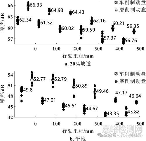 圖3 兩種制動(dòng)盤匹配相同的摩擦片在平地和20%坡道上的蠕動(dòng)噪聲