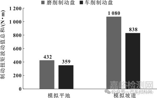 為了更加客觀反映蠕動(dòng)噪聲發(fā)生時(shí)的界面行為,在臺(tái)架進(jìn)行300次磨合制動(dòng)后測(cè)試模擬蠕動(dòng)噪聲得到扭矩波動(dòng)值總和如圖5所示。圖中結(jié)果顯示,模擬坡道測(cè)試記錄的扭矩波動(dòng)值的總和為800~1 200 N·m,顯著大于模擬平地的300~400 N·m。而車削制動(dòng)盤產(chǎn)生的扭矩波動(dòng)值之和顯著低于磨削制動(dòng)盤,在平地模擬測(cè)試中,車削制動(dòng)盤產(chǎn)生的扭矩波動(dòng)值總和比磨削制動(dòng)盤低17%;而在20%坡道模擬測(cè)試中,兩者差異達(dá)到了22%。以上結(jié)果意味著,使用車削制動(dòng)盤可以顯著降低起步過程中的制動(dòng)扭矩波動(dòng),即摩擦副將具有更好的蠕動(dòng)噪聲性能,這一結(jié)果與實(shí)車測(cè)試結(jié)果具有良好的一致性。