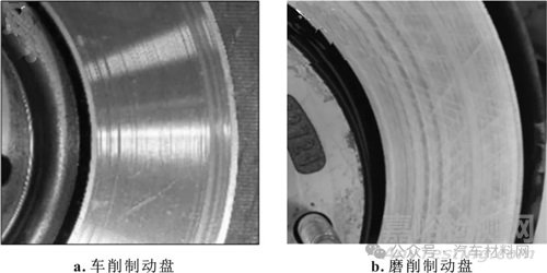(2)具有同心圓加工紋路的車削制動(dòng)盤,其加工紋路與摩擦方向一致,因而摩擦片表面較快地形成連續(xù)的摩擦面,因此其蠕動(dòng)噪聲性能較好。