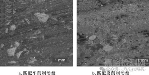 圖6和圖7分別為臺(tái)架模擬蠕動(dòng)噪聲測(cè)試后的制動(dòng)盤和摩擦片。車削制動(dòng)盤的外觀光滑平整,原始的車削紋路變小,產(chǎn)生了一些制動(dòng)摩擦紋路,總體比較平整光滑。而磨削制動(dòng)盤表面依然可以看到原始的發(fā)散狀的加工紋路,且出現(xiàn)了兩條暗色的同心圓。進(jìn)一步觀察摩擦片的顯微鏡照片,車削制動(dòng)盤所用的摩擦片表面形成了連續(xù)、光滑的摩擦面,而磨削制動(dòng)盤所用的摩擦片表面相對(duì)粗糙,摩擦膜并未形成整體。由此可見,車削制動(dòng)盤的條紋與摩擦方向一致,有利于摩擦界面盡快進(jìn)入良好的貼合狀態(tài),因此在蠕動(dòng)噪聲上產(chǎn)生了顯著的差異。