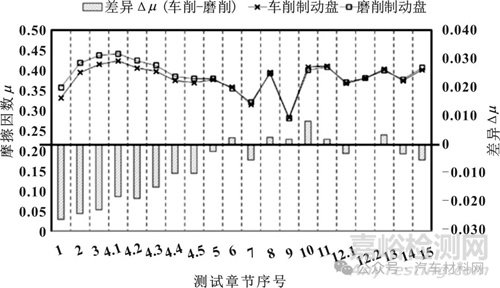 兩者的差異(圖8的柱狀圖)主要體現(xiàn)在第1至第4.5章節(jié),采用車削制動(dòng)盤的初始摩擦因數(shù),略低于磨削制動(dòng)盤的初始摩擦因數(shù),兩者差異為負(fù)值。造成這個(gè)差異的原因是磨削盤表面雜亂的條紋,增大了制動(dòng)盤的粗糙度,與摩擦片表面容易形成較多的接觸點(diǎn)。而車削制動(dòng)盤表面紋路為同心圓形式,與制動(dòng)盤的轉(zhuǎn)動(dòng)方向一致,因此不利于摩擦片表面與制動(dòng)盤的咬合。但是,隨著制動(dòng)次數(shù)的不斷增加,制動(dòng)盤表面的加工紋路逐漸消失,被摩擦產(chǎn)生的制動(dòng)劃痕所替代,因此當(dāng)程序進(jìn)入第4.4章節(jié)后,兩種制動(dòng)盤在的摩擦因數(shù)逐漸接近一致。