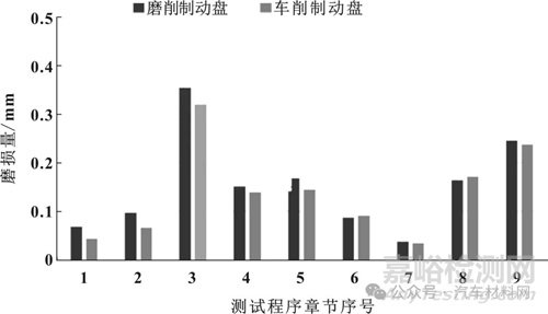 對(duì)不同種類的制動(dòng)盤,采用SAE J2707A的程序研究了摩擦副的磨損性能,如圖9所示。由圖可以看到,磨削制動(dòng)盤對(duì)應(yīng)的摩擦片在第1至第3章節(jié)的磨損量,均高于用車削制動(dòng)盤的摩擦片,這與其前期摩擦因數(shù)較高的結(jié)果是一致的。