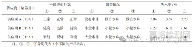 取2個TSA,稱量其重量,于較高的側(cè)面風(fēng)速下倒置擺放72 h后,再稱量其重量,根據(jù)前后重量差計算失水率,將每個供應(yīng)商產(chǎn)品進(jìn)行3個不同批次的獨立平行試驗。氣流可吹至培養(yǎng)皿內(nèi),導(dǎo)致平皿污染、失水,并在皿蓋上形成水珠或水霧,應(yīng)選擇失水率最少的產(chǎn)品。
