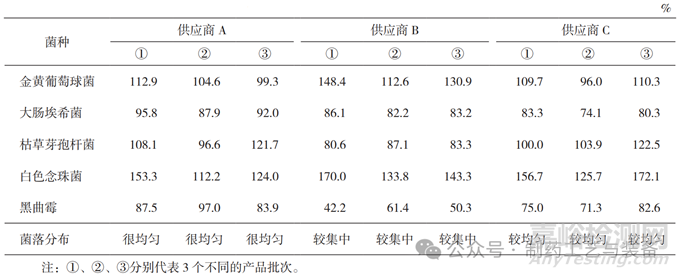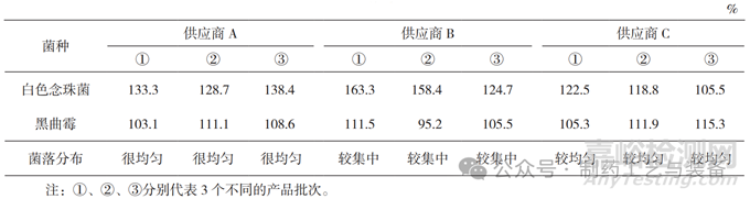 取2個TSA和SDA,置30~35 ℃和20~25 ℃下培養(yǎng)72 h和5 d后,觀察結(jié)果,將每個供應(yīng)商產(chǎn)品進(jìn)行3個不同批次的獨立平行試驗。經(jīng)培養(yǎng)后,2個平皿應(yīng)無菌生長。