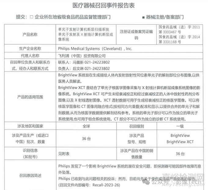 2023年12月25日,國家藥監(jiān)局官網(wǎng)公布了飛利浦正在主動召回單光子發(fā)射及X射線計算機(jī)斷層成像系統(tǒng)、單光子發(fā)射計算機(jī)斷層掃描系統(tǒng),召回級別為一級召回。涉及產(chǎn)品的型號、序列號如下: