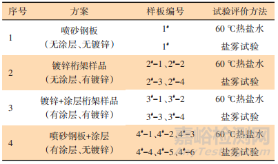 在現(xiàn)場(chǎng)光伏大規(guī)模試驗(yàn)的同時(shí),為驗(yàn)證桁架防腐方案的可靠性,使用桁架截取的小樣和同材質(zhì)試驗(yàn)鋼板進(jìn)一步對(duì)防腐效果進(jìn)行試驗(yàn)評(píng)價(jià)。試驗(yàn)方案如表3所示。