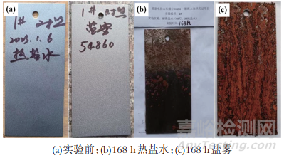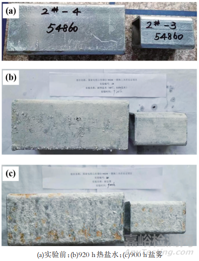 試驗(yàn)所用鍍鋅小樣為現(xiàn)場(chǎng)桁架截取,鍍鋅厚度為105μm;3#鍍鋅+涂層設(shè)計(jì)為105μm鍍鋅層、60μm鍵合型環(huán)氧連接漆、120μm鍵合型環(huán)氧中間漆、80μm高耐候脂肪族聚氨酯面漆;4#涂層設(shè)計(jì)為80μmJ專用環(huán)氧底漆、200μm鍵合型環(huán)氧中間漆、80μm高耐候脂肪族聚氨酯面漆。試驗(yàn)中,耐熱鹽水試驗(yàn)環(huán)境為60℃、3.5%氯化鈉溶液,耐鹽霧試驗(yàn)環(huán)境為鹽霧試驗(yàn)箱中標(biāo)準(zhǔn)鹽霧環(huán)境。鍍鋅+涂層方案以及涂層方案實(shí)驗(yàn)依據(jù)JTS153-2015《水運(yùn)工程結(jié)構(gòu)耐久性設(shè)計(jì)標(biāo)準(zhǔn)》設(shè)計(jì)。