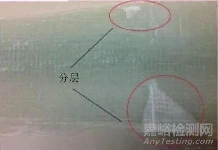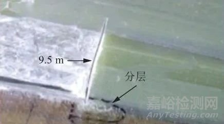 通常葉片發(fā)生斷裂主要是生產(chǎn)過程中工藝控制不良導(dǎo)致。生產(chǎn)過程中葉片根部局部區(qū)域樹脂固化不完全導(dǎo)致強(qiáng)度、剛度降低,在疲勞載荷作用下風(fēng)電葉片發(fā)生斷裂,如圖11所示。此外風(fēng)速超限、風(fēng)電機(jī)組失速、電氣故障以及雷擊等也是導(dǎo)致風(fēng)電葉片斷裂的原因。