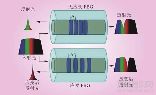 FBG的工作原理是在光纖上刻蝕一特定間距的圖案,可以在不同的位置實現(xiàn)期望的折射特性。當(dāng)光柵區(qū)域被外部載荷激發(fā)時,會引起變形,從而改變有效折射率。FBG在使用時須嵌入到葉片內(nèi)部,當(dāng)葉片發(fā)生應(yīng)變時,光柵布拉格傳感器的折射率會發(fā)生改變,其反射回的反射光波長也會發(fā)生相應(yīng)改變,可以通過特殊的測量裝置監(jiān)測出這種應(yīng)變。光纖布拉格傳感器工作原理如圖13所示。