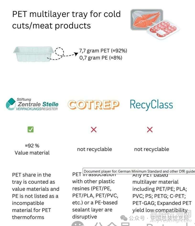 無論PET與PE,PET與PA,還是PET與PLA等材料的多層復(fù)合,RecyClass和Cotrep的定義是都與PET物理回收不相容。然而,德國最低標(biāo)準(zhǔn)設(shè)定,如果盒子當(dāng)中PET材料的含量不低于92%,則當(dāng)中的PE不會被認(rèn)為是不相容的。