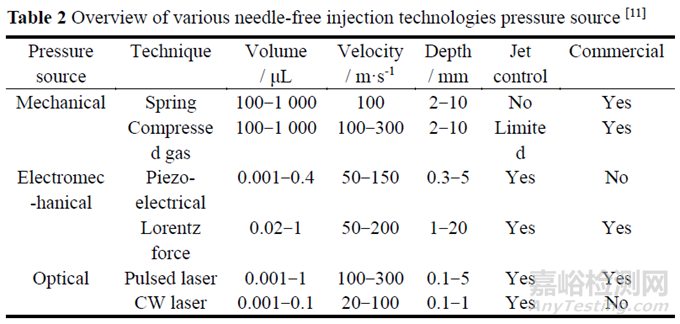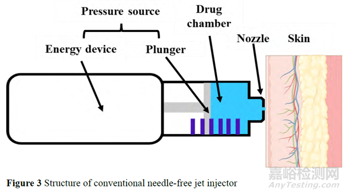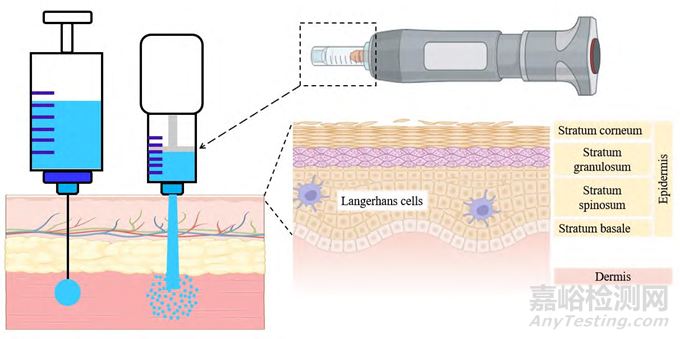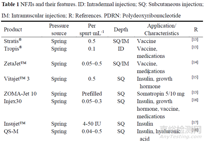 NFIT具有以下優(yōu)點(diǎn): ①防止皮膚穿刺傷, 不易引起出血、擦傷及皮膚局部反應(yīng); ②可以快速給藥, 并且注射劑量精準(zhǔn), 有良好的重復(fù)性; ③有良好的劑量反應(yīng)關(guān)系, 提高藥物的生物利用度; ④避免藥物在注射過(guò)程中受復(fù)溶及剪切效應(yīng)影響; ⑤操作簡(jiǎn)單, 消除針頭恐懼癥, 患者可以自我使用; ⑥提高機(jī)體對(duì)疫苗的免疫反應(yīng); ⑦可以用于大分子藥物注射, 促進(jìn)核酸、蛋白質(zhì)類(lèi)藥物遞送技術(shù)的發(fā)展; ⑧增加藥物的給藥形式, 可以實(shí)現(xiàn)干粉狀態(tài)遞送水敏感藥物。