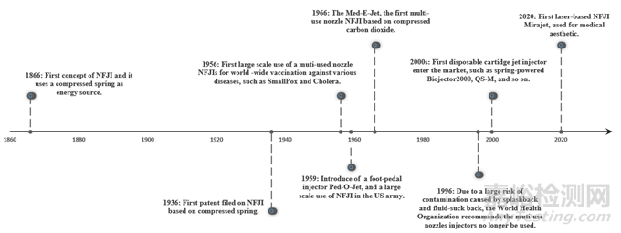 NFIT的概念起源于19世紀(jì), 但是首個(gè)現(xiàn)代意義上的無(wú)針注射器(needle-free jet injector, NFJI)專(zhuān)利直到1936年才出現(xiàn)。20世紀(jì)40到60年代, NFJI被美國(guó)軍隊(duì)廣泛用于天花、乙肝、麻疹、霍亂、脊髓灰質(zhì)炎等疫苗接種, 其接種效率高達(dá)每h1000人次。20世紀(jì)末, 由于混用噴嘴、注射回流和回吸等問(wèn)題引起的交叉感染風(fēng)險(xiǎn), 混用噴嘴被WHO禁止使用。21世紀(jì)初, 1次性噴嘴的出現(xiàn)解決了交叉感染的問(wèn)題, NFJI迎來(lái)新的發(fā)展時(shí)期。關(guān)于NFIT發(fā)展的時(shí)間線如圖2所示。