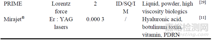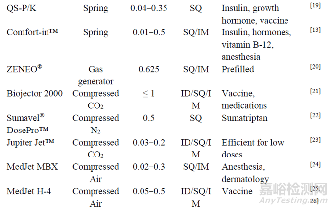 治療性注射劑主要包括與身體相互作用的藥物, 通常是治療體積小、效價(jià)高、作用于局部或全身的藥物, 如胰島素、疫苗、生長(zhǎng)激素、核酸、麻醉藥物、單克隆抗體、抗菌藥物等。在胰島素注射方面, 使用NFJI的主要目的是消除針頭恐懼, 如Insujet™、QS-M等, 其操作簡(jiǎn)單、劑量精準(zhǔn)的特性對(duì)糖尿病患者來(lái)說(shuō)非常友好。目前國(guó)內(nèi)的相關(guān)研究主要是壓縮彈簧驅(qū)動(dòng)的QS系列, 多項(xiàng)研究證明應(yīng)用NFJI能有效管理血糖, 降低疼痛, 起效更快, 控制血糖效果更佳。在疫苗接種方面, 利用ZetaJet™、Biojector2000等可以增強(qiáng)免疫應(yīng)答, 減少接種的劑量, 提高接種效率, 并且減少針頭恐懼癥, 有助于大規(guī)模接種。Mao等針對(duì)新冠病毒使用QS-P建立了mRNA脂質(zhì)納米粒疫苗的疫苗遞送系統(tǒng)。除此以外, 利多卡因、丁卡因等局部麻醉藥物可以通過(guò)MedJet MBX、Comfort-in™等NFJI更快地發(fā)揮局部麻醉作用, 生長(zhǎng)激素可以通過(guò)QS-K、ZOMA-Jet10、Medi-Jector®注射, 并顯示出相同甚至更好的治療作用。體外研究數(shù)據(jù)顯示, DosePro™可以有效地遞送阿達(dá)木單克隆抗體。NFJI還可以遞送維生素、抗生素、肉毒毒素、博來(lái)霉素等液體治療性注射劑。除了常規(guī)的液體注射劑以外, Schlich等評(píng)價(jià)了Comfort-in™遞送雙氯芬酸納米晶混懸液的鎮(zhèn)痛效果, 證明NFJI可以遞送納米混懸液劑型。