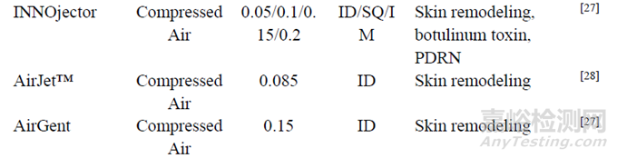 惰性注射劑是指不含治療性活性化合物, 對(duì)于人體組織不發(fā)揮臨床作用的制劑, 其應(yīng)用實(shí)例包括永久妝容和其他醫(yī)療美容注射。惰性注射劑受加熱或剪切應(yīng)力而降解的風(fēng)險(xiǎn)非常低, NFIT賦予的高速射流可以拉伸成纖維細(xì)胞, 激活生長(zhǎng)因子, 減少膠原蛋白的分解。透明質(zhì)酸和生理鹽水經(jīng)INNOjector™、AirJet™、Airgent™等注射可以用于治療凹陷性瘢痕、肥厚性瘢痕、皺紋等皮膚損傷。NFIT遞送惰性注射劑還可以用于乳房切除術(shù)后模擬乳頭、美化疤痕或胎記, 在減少對(duì)皮膚傷害的同時(shí)顯示出更高的遞送效率。