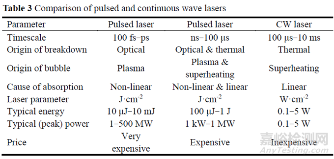 脈沖激光器或連續(xù)激光器2種壓力源的特征見(jiàn)表3。脈沖激光器通常在飛秒到微秒級(jí)別的時(shí)間內(nèi)提供100μJ到1J的能量, 脈沖持續(xù)時(shí)間越短, 能量吸收及氣泡生長(zhǎng)越快, 噴射流的速度越快, 但脈沖激光器價(jià)格昂貴, 且體積大, 限制了其應(yīng)用與發(fā)展。現(xiàn)有的脈沖激光器包括Nd: YAG激光器(532/1064nm, 7ns)、Er: YAG激光器(2940nm, 250μs)和Krizek等設(shè)計(jì)的激光器(1570nm, 6ns)。其中Mirajet®使用Er: YAG激光器已應(yīng)用于皮膚重塑及美容領(lǐng)域。連續(xù)波激光器的輸出功率相對(duì)較低, 液體在數(shù)毫秒內(nèi)吸收能量, 溫度超過(guò)沸點(diǎn), 形成蒸汽氣泡, 即熱空化效應(yīng)。連續(xù)波激光器體積更小、更便宜, 不需要主動(dòng)冷卻, 是一種較為理想的壓力源。然而, 由于熱空化只依賴(lài)于線性吸收, 需要激光波長(zhǎng)和液體相匹配產(chǎn)生較高的吸收系數(shù)(α≈100cm-1), 如近紅外光與硫酸銅溶液、藍(lán)色激光與直接紅81染料等。另外, 連續(xù)波激光器存在腐蝕性、安全性、微流控制等方面問(wèn)題, 其發(fā)展仍需要進(jìn)一步實(shí)驗(yàn)。