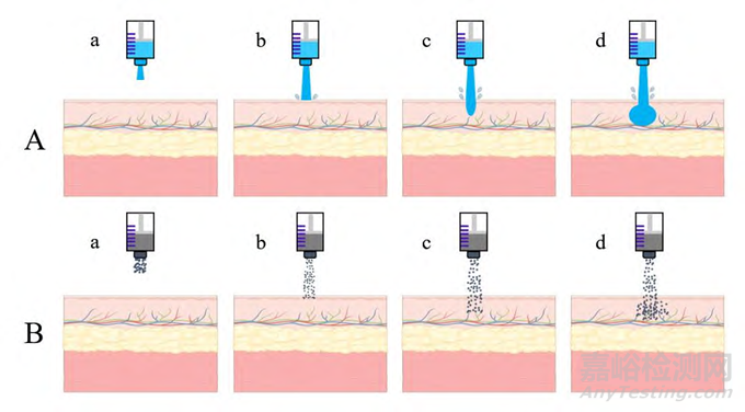 NFIT具有防止意外針刺傷、提高藥物生物利用度、消除針頭恐懼、增加疫苗免疫效果、簡(jiǎn)化操作及易于患者自用等優(yōu)勢(shì), 國(guó)內(nèi)外目前已廣泛應(yīng)用于疫苗接種、糖尿病管理、皮膚病治療、醫(yī)療美容、局部麻醉、基因治療、納米藥物遞送等領(lǐng)域。根據(jù)NFJI遞送的藥物形態(tài)不同分為液體、粉末和儲(chǔ)庫(kù)型制劑。液體(圖4A)和粉末(圖4B)為NFJI的注射過(guò)程如圖4所示。
