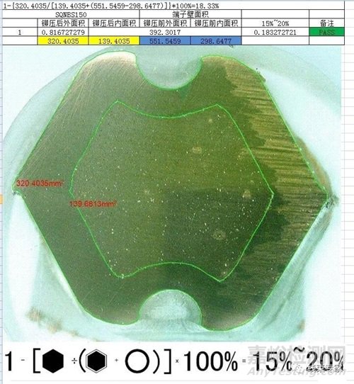 端子壓接面積是否合格主要通過2個方面:一個是計算壓縮比,另一個是計算縮小比,壓縮率和縮小比相加等于1。