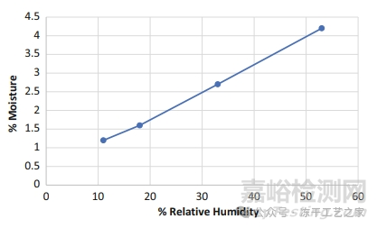 表 二 和圖 五 總結(jié)了卡爾費(fèi)休法測(cè)量的暴露于不同相對(duì)濕度百分比后的含水量;