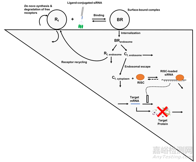圖3. GalNac siRNA進入細胞、細胞內(nèi)分布和發(fā)揮藥理學(xué)活性的過程和關(guān)鍵步驟[2]
