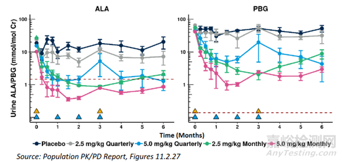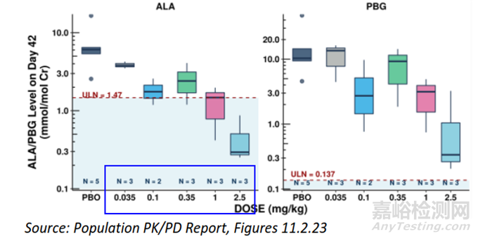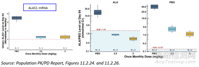 圖5. Givosiran劑量-尿ALA/PBG水平(上)、劑量-尿ALAS1 mRNA/ALA/RBG水平(中)、劑量-尿ALA/PBG水平(下)相關(guān)性分析[4]