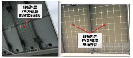 可能形成原因:組件使用背板材料不合格,內(nèi)層PET耐候性能較差。該類問題會導(dǎo)致組件密封及防水性能降低,嚴(yán)重影響組件的安全絕緣性能。